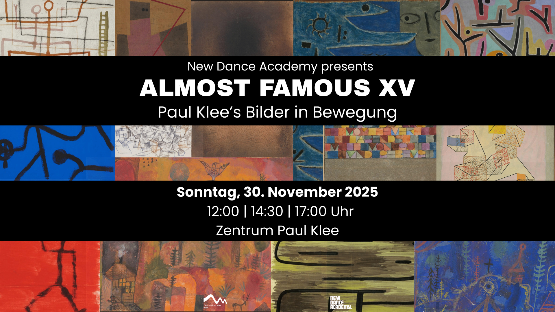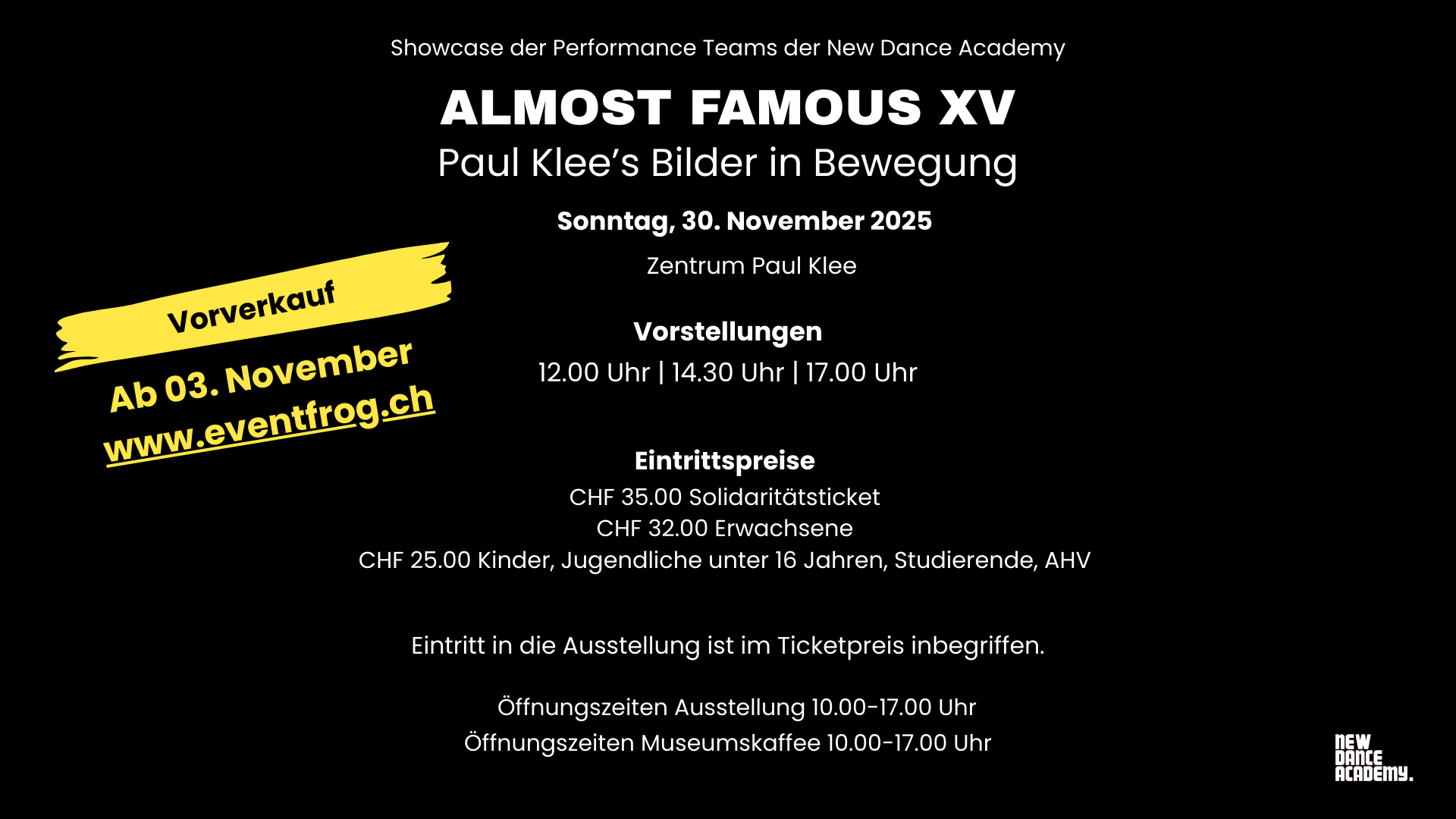 Das erste Projekt unserer neuen Performance Teams steht bevor - Am 30. November 2025 präsentieren wir in Zusammenarbeit mit dem Zentrum Paul Klee die 15. Edition vom Almost Famous. Jedes Performance Team wird ein Gemälde von Paul Klee tänzerisch interpretieren und so seine Kunstwerke in Bewegung zum Leben erwecken. Almost Famous XV findet direkt im Zentrum Paul Klee statt - ein inspirierender Ort für ein einzigartiges Tanzprojekt. Der Museumseintritt ist im Ticketpreis einbegriffen. Der Vorverkauf startet am 03. November 2025.