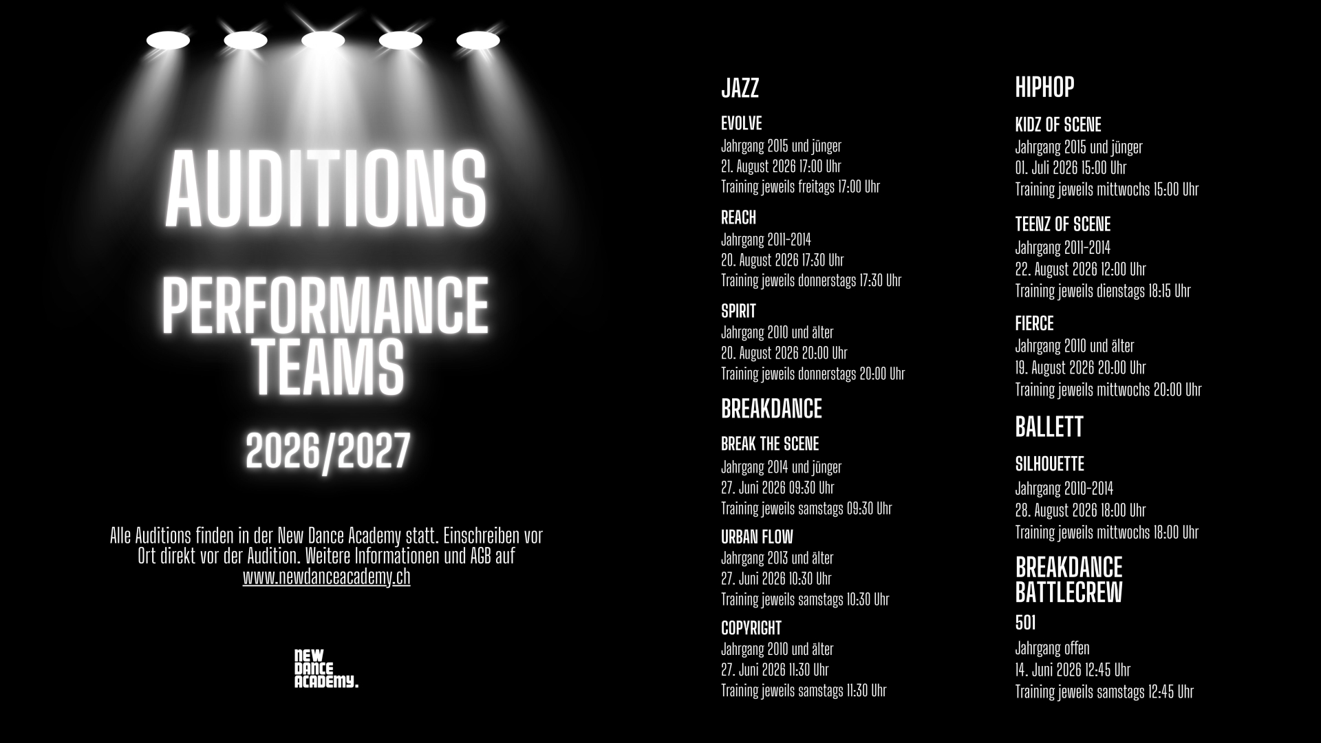 Alle Auditions finden in der New Dance Academy statt. Einschreiben direkt vor Ort direkt vor der Audition.